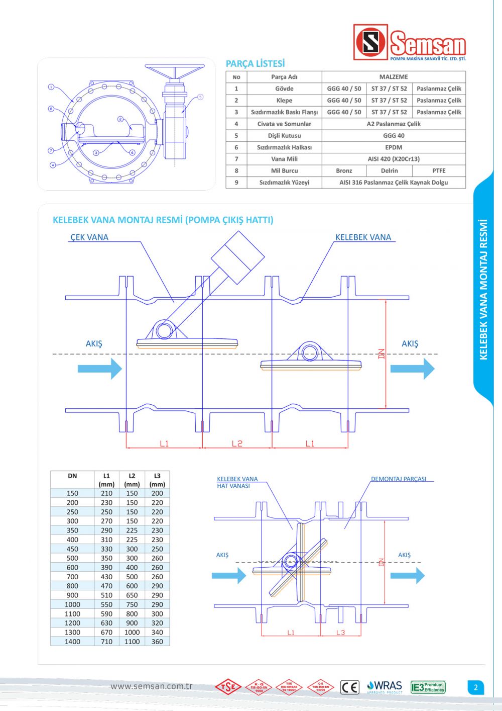 | DN | Flanştan Flanşa | PN10 | PN16 | PN25 | PN40 | |||||||||||||||||||||